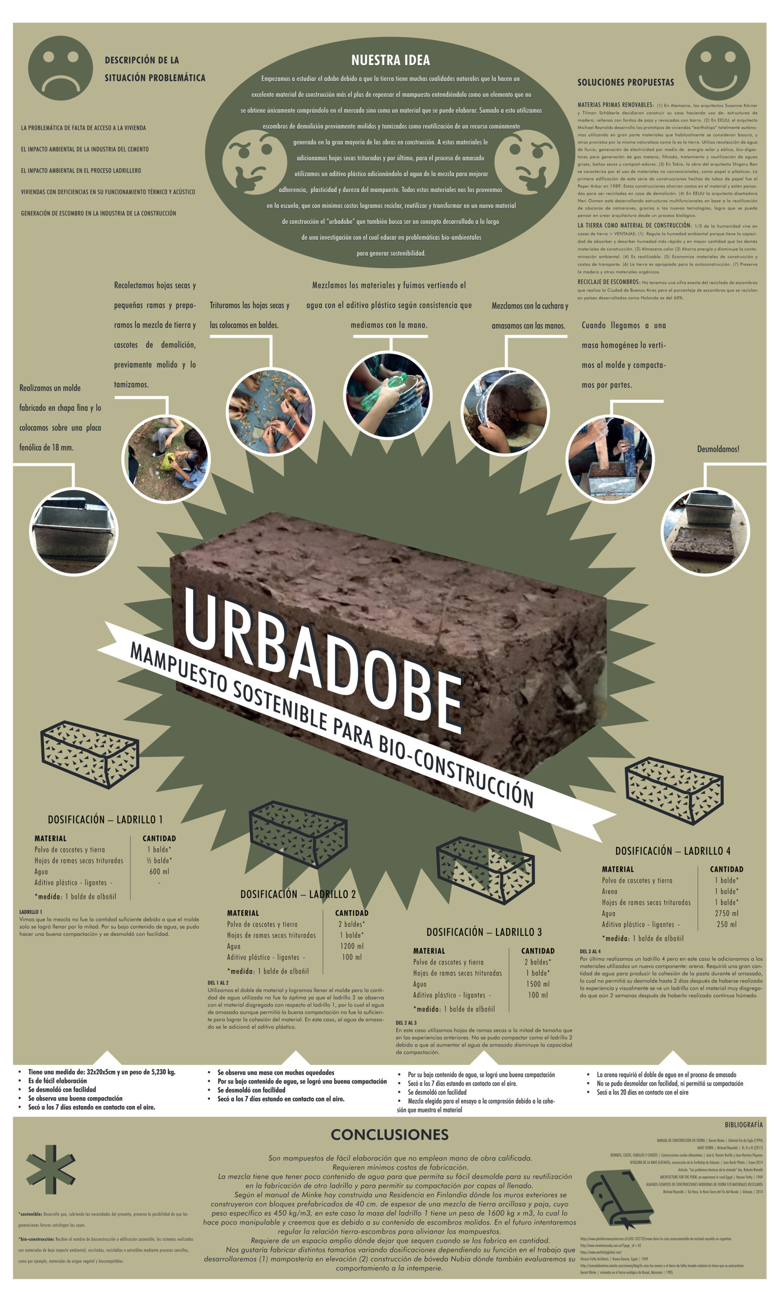 Proyecto de investigación en bio-construcción realizado junto a docentes y alumnos de la Escuela Técnica n°13, donde creamos un mampuesto sostenible reutilizando escombros de demolición molido, tierra, hojas secas y aditivos y logramos producir un ladrillo que está hecho con materiales reciclados o del lugar, produce un ahorro energético al no estar cosido, responde térmica y estructuralmente, tiene muy bajo costo y está pensado para reciclarse sin impacto ambiental, de ser necesario.